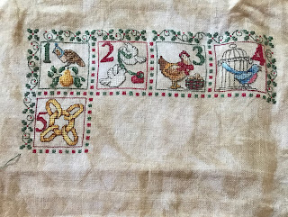 Here is a reminder of what the completed piece will look like. I think I am going to spend the rest of May working on the Partridge Tree in the Center. I debated whether or not to stitch this part, or just the 12 days, and I decided I to do this design as it appears. The more I stitch on it, the easier the fractionals stitches are getting. Guess that is pretty much true in all aspects of my life.